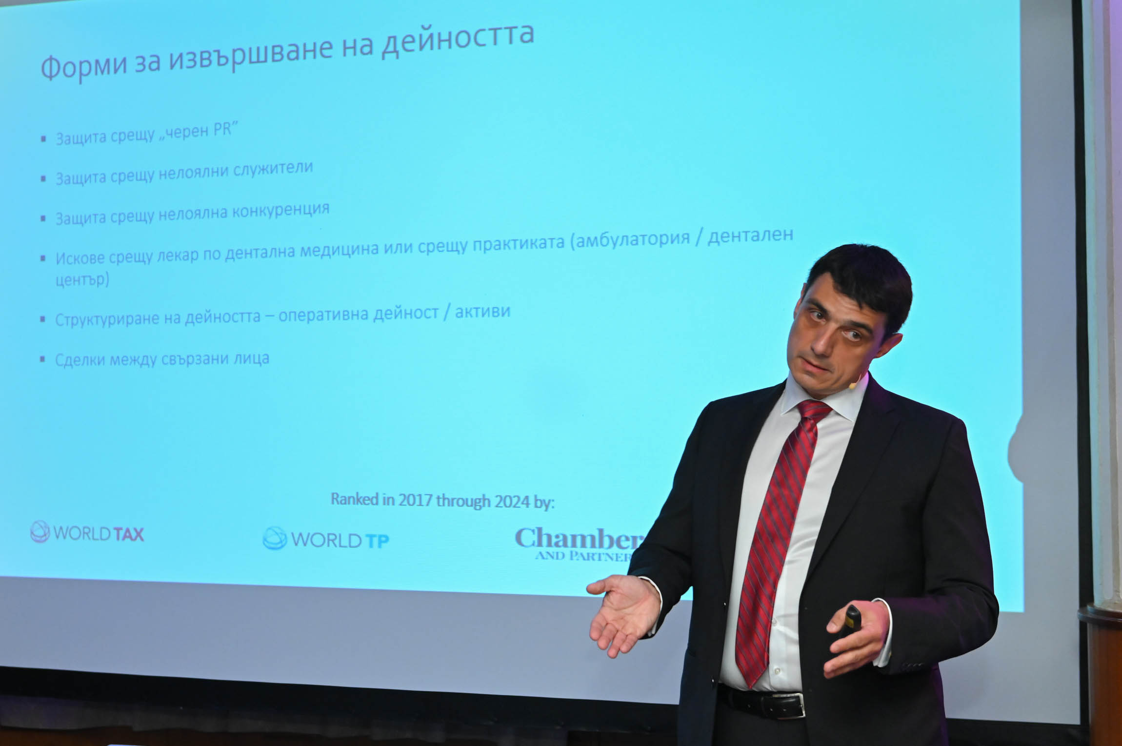 Адв. Савов се спря на защитата срещу черен ПР, защитата срещу нелоялни служители и нелоялна конкуренция, исковете срещу лекари по дентална медицина или срещу денталната практиката, структуриране на дейността – оперативна дейност и активи, сделките между свързани лица.