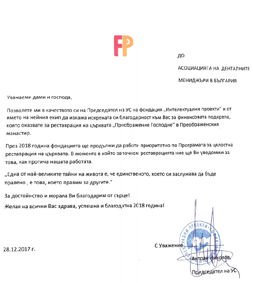 Позволете ми в качеството си на Председател на УС на фондация „Интелектуални проекти” и от името на нейния екип да изкажа искрената си благодарност към Вас за финансовата подкрепа, която оказвате за реставрация на църквата „Преображение Господне” в Преображенския манастир.