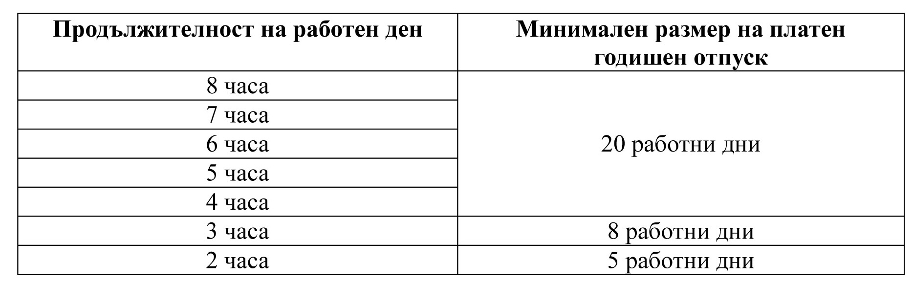 Когато Служителят полага труд при непълен работен ден, размерът на платения годишен отпуск се определя пропорционално на времето, което му се признава за трудов стаж (чл. 23, ал. 2 Наредба за работното време, почивките и отпуските). Имайки всичко изложено до тук предвид, размерът на минималния платен годишен отпуск спрямо продължителността на работния ден е както следва: